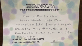 2023年11月14日幼稚園本日はとても楽しいサイエンスショーをありがとうございました!ふつうのマジックとサイエンスマジックとの合体で、子どもたちにもわかりやすく、大笑いできるショーだったと親としても嬉しく思います。お二人の動きのコミカルさ...