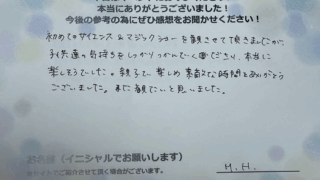 初めてのサイエンスマジックショーを観させていただきましたが、子供達の気持ちをしっかり掴んで下さり、本当に楽しそうでした。親子で楽しめ、素敵な時間をありがとうございました。また観たいと思いました。 千葉県 M.H