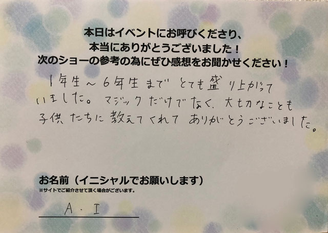 お客様の声一年生から6年生までとても盛り上がっていました。マジックだけでなく大切なことも子供たちに教えてくれてありがとうございました。