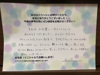 ふつうのマジックとサイエンスマジックとの合体で、子どもたちにもわかりやすく、大笑いできるショーだったと親としても嬉しく思います。