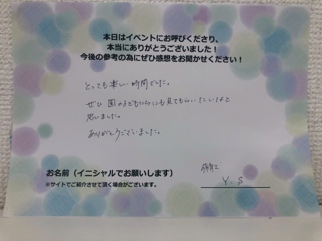 お客様の声とっても楽しい時間でした。ぜひ園の子供たちにも見てもらいたいと思いました。ありがとうございました。