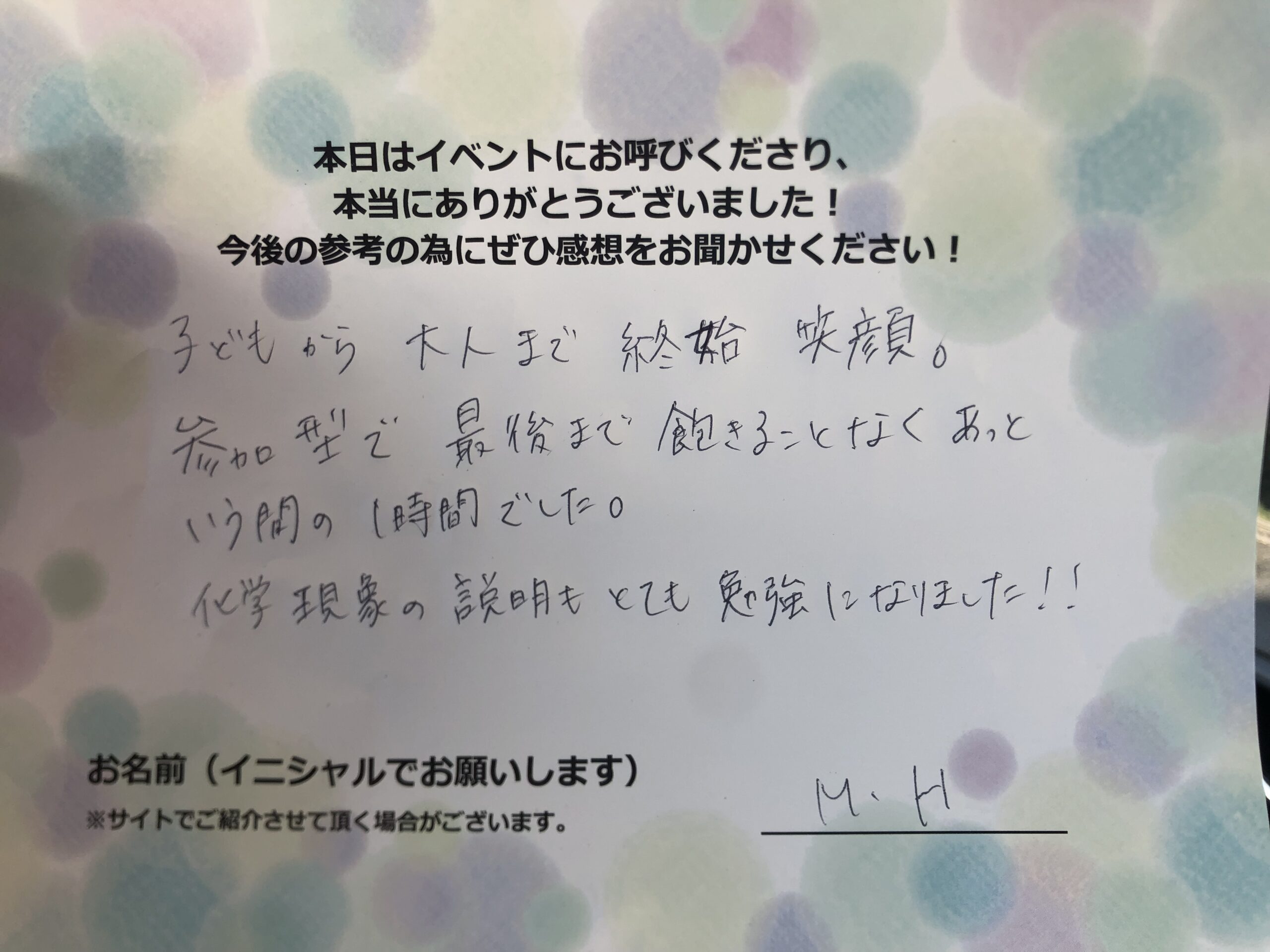 お客様の声子供から大人まで終始笑顔参加型で最後まで飽きることなくあっという間の1時間でした。科学現象の説明もとても勉強になりました。 M.H
