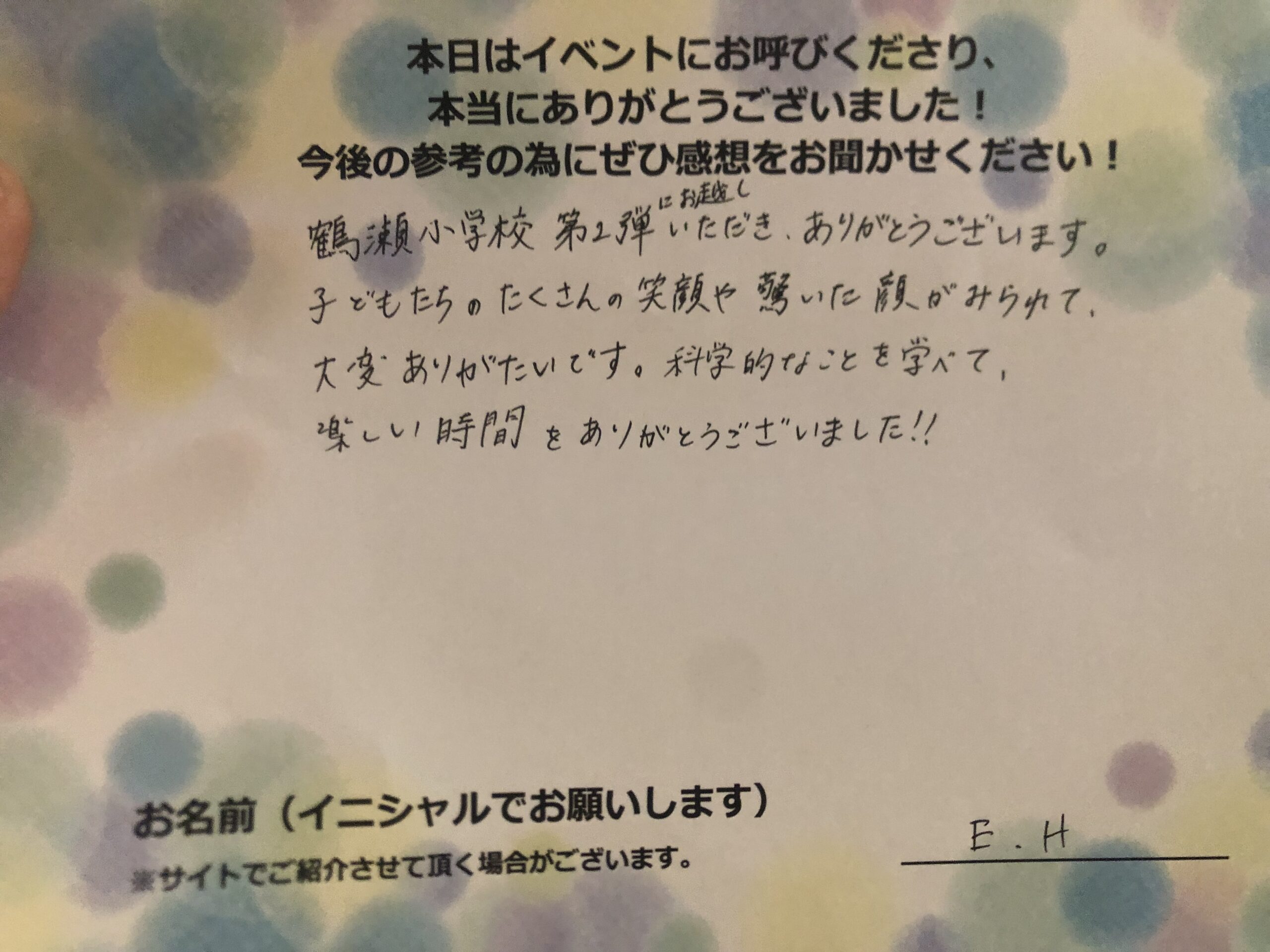 つるせ小学校第二弾にお越しいただきありがとうございます。子供たちのたくさんの笑顔や驚いた顔が見られて大変ありがたいです。科学的なことを学べて楽しい時間をありがとうございました!! E.H