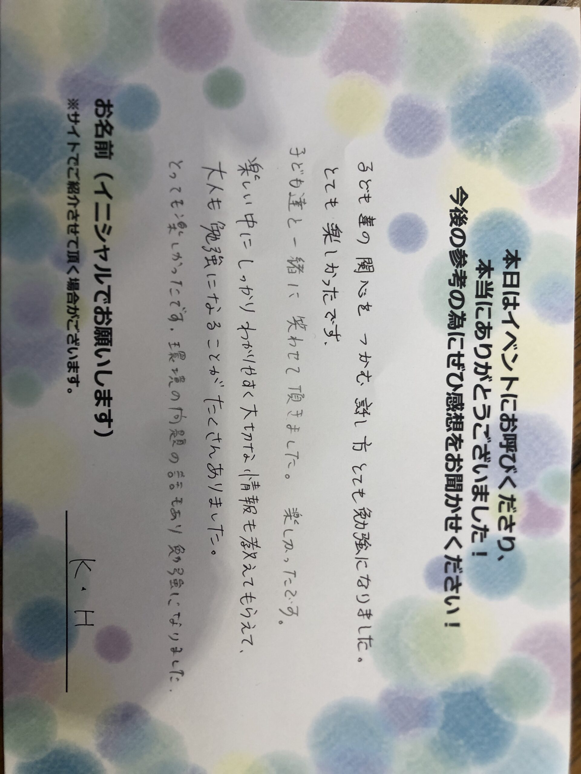 子供たちの関心をつかむ話し方、とても勉強になりました。とても楽しかったです。子供たちと一緒に笑わせていただきました。楽しかったです。楽しい中にしっかりわかりやすく大切な情報も教えてもらえて、大人も勉強になることがたくさんありました。とっても楽しかったです。環境の問題の話もあり勉強になりました。 K.H