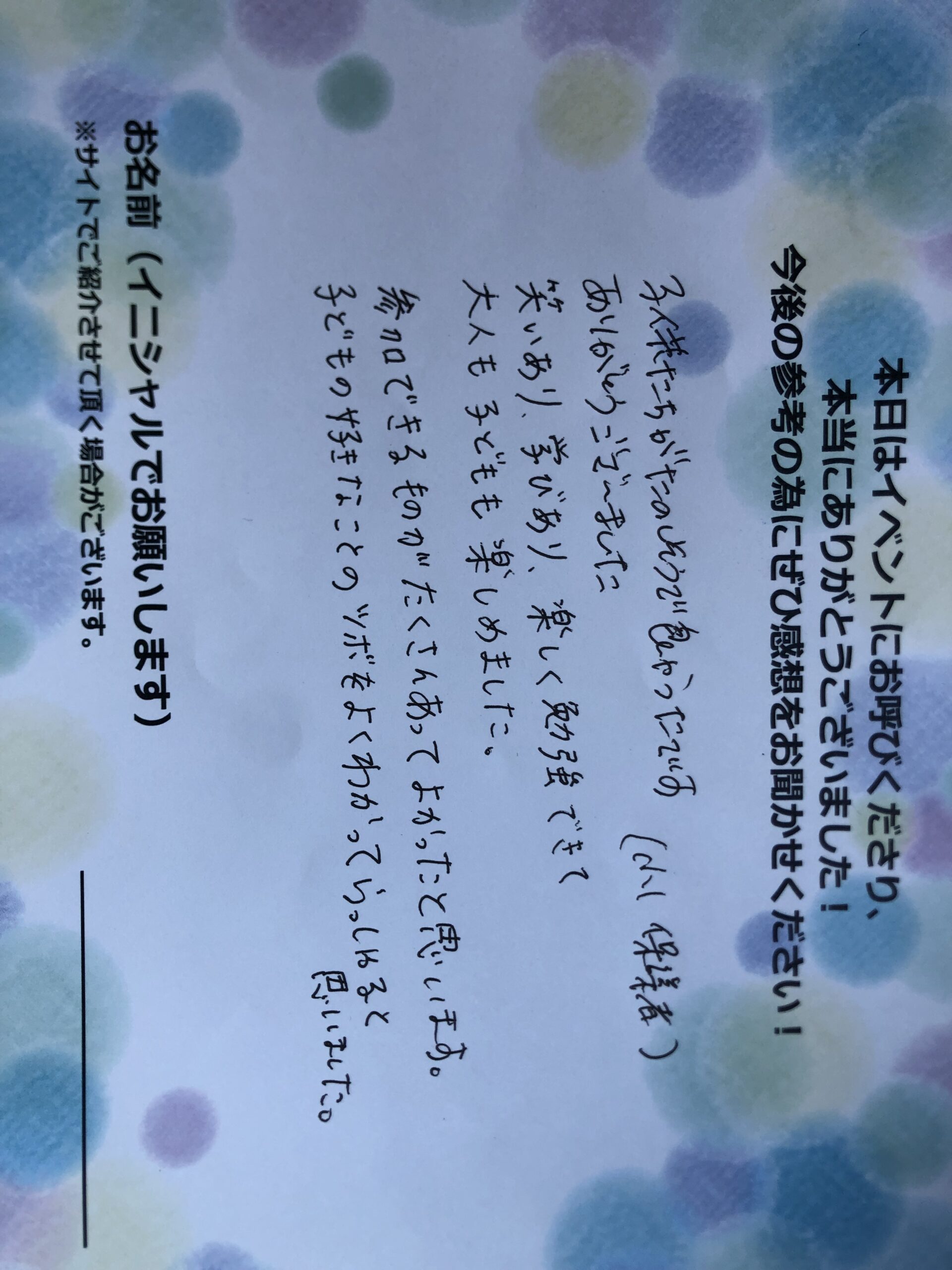 子供たちが楽しそうで良かったです。ありがとうございました笑もあり学びあり楽しく勉強できて大人も子供も楽しめました。参加できるものがたくさんあって良かったと思います。子供の好きなことのツボをよくわかっていらっしゃるなと思いました。 小1保護者