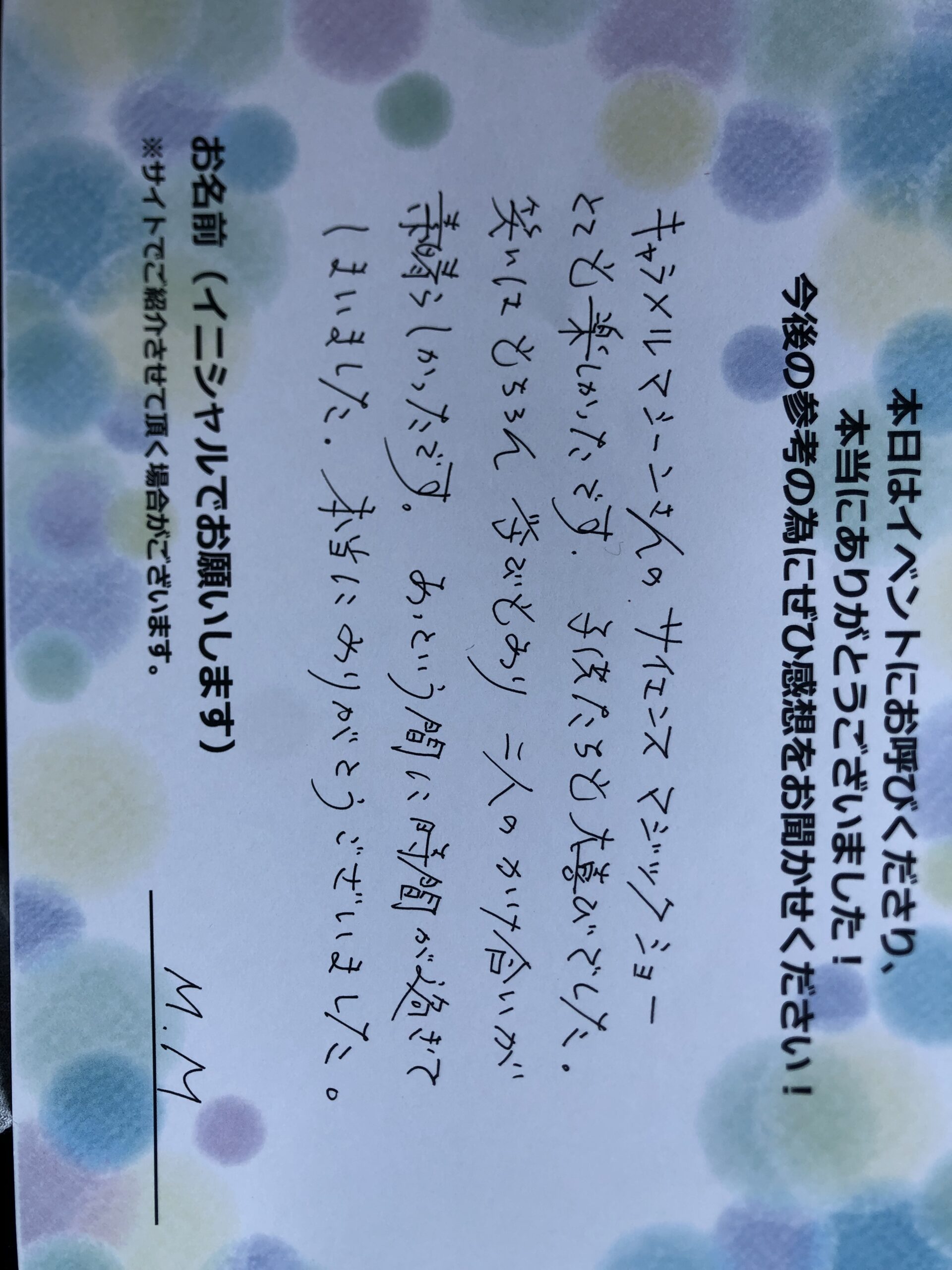 キャラメルマシーンさんのサイエンスマジックショーとても楽しかったです。子供たちも大喜びでした。笑いはもちろん学びもあり、2人の掛け合いが素晴らしかったです。あっという間に時間が過ぎてしまいました。本当にありがとうございました。 M.M