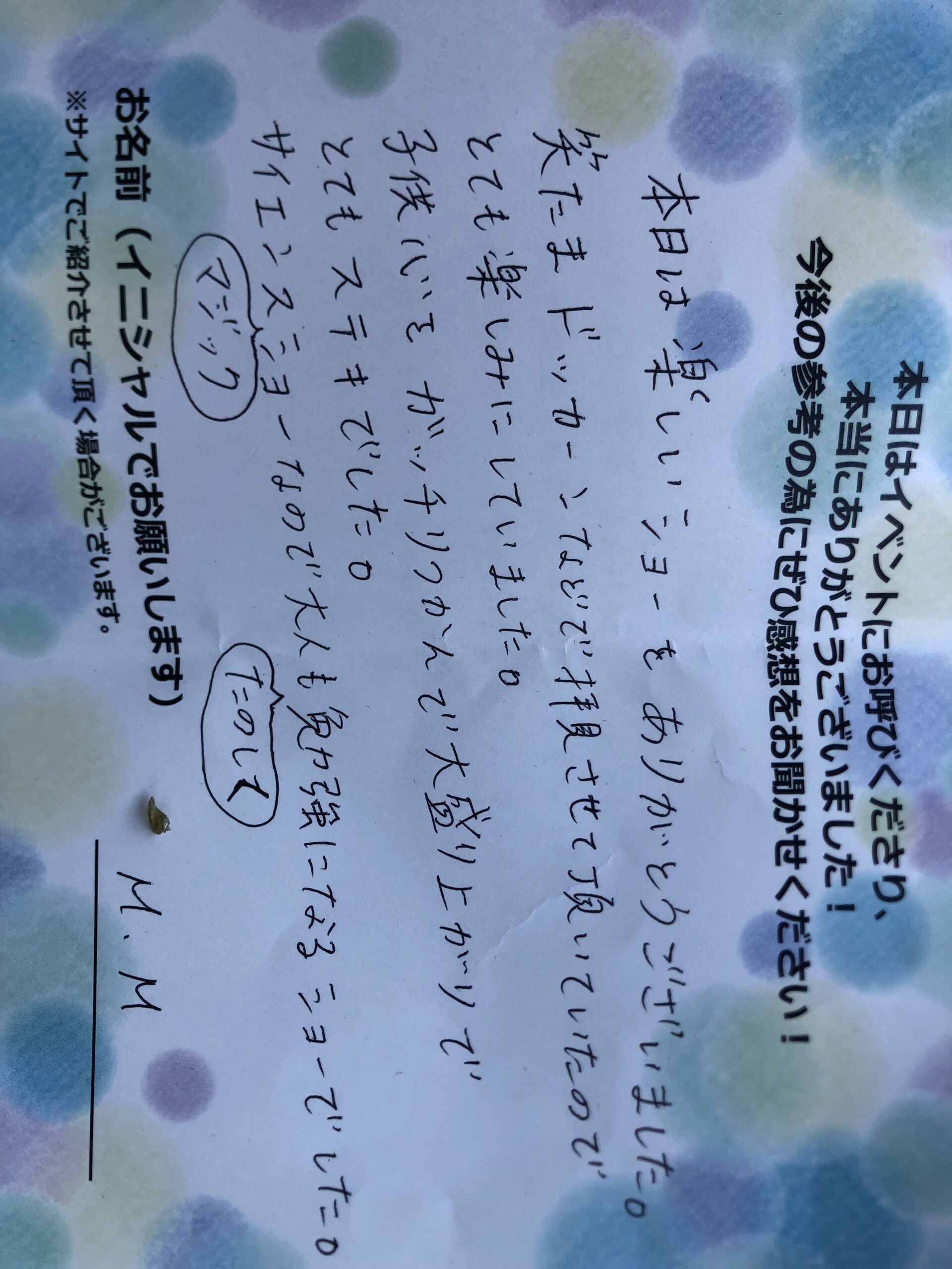 本日は楽しいショーをありがとうございました。笑たまドッカーンなどで拝見させていただいていたのでとても楽しみにしていました。子供心をがっちり掴んで大盛り上がりでとても素敵でした。サイエンスマジックショーなので、大人も楽しく勉強になるショーでした。 M.M