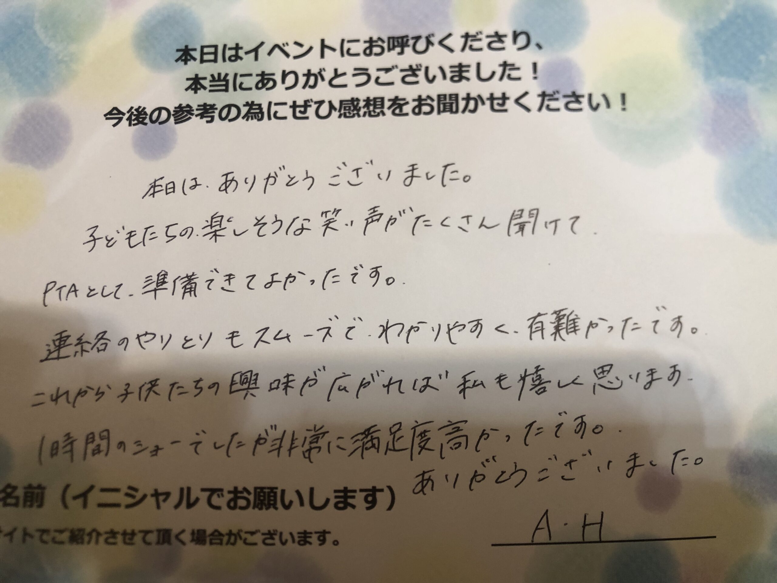 本日はありがとうございました。子供たちの楽しそうな笑い声がたくさん聞けて、PTAとして準備できてよかったです。連絡のやりとりもスムーズでわかりやすくありがたかったです。これから子供たちの興味が広がれば私も嬉しく思います。1時間のショーでしたが非常に満足度高かったです。ありがとうございました。 A.H