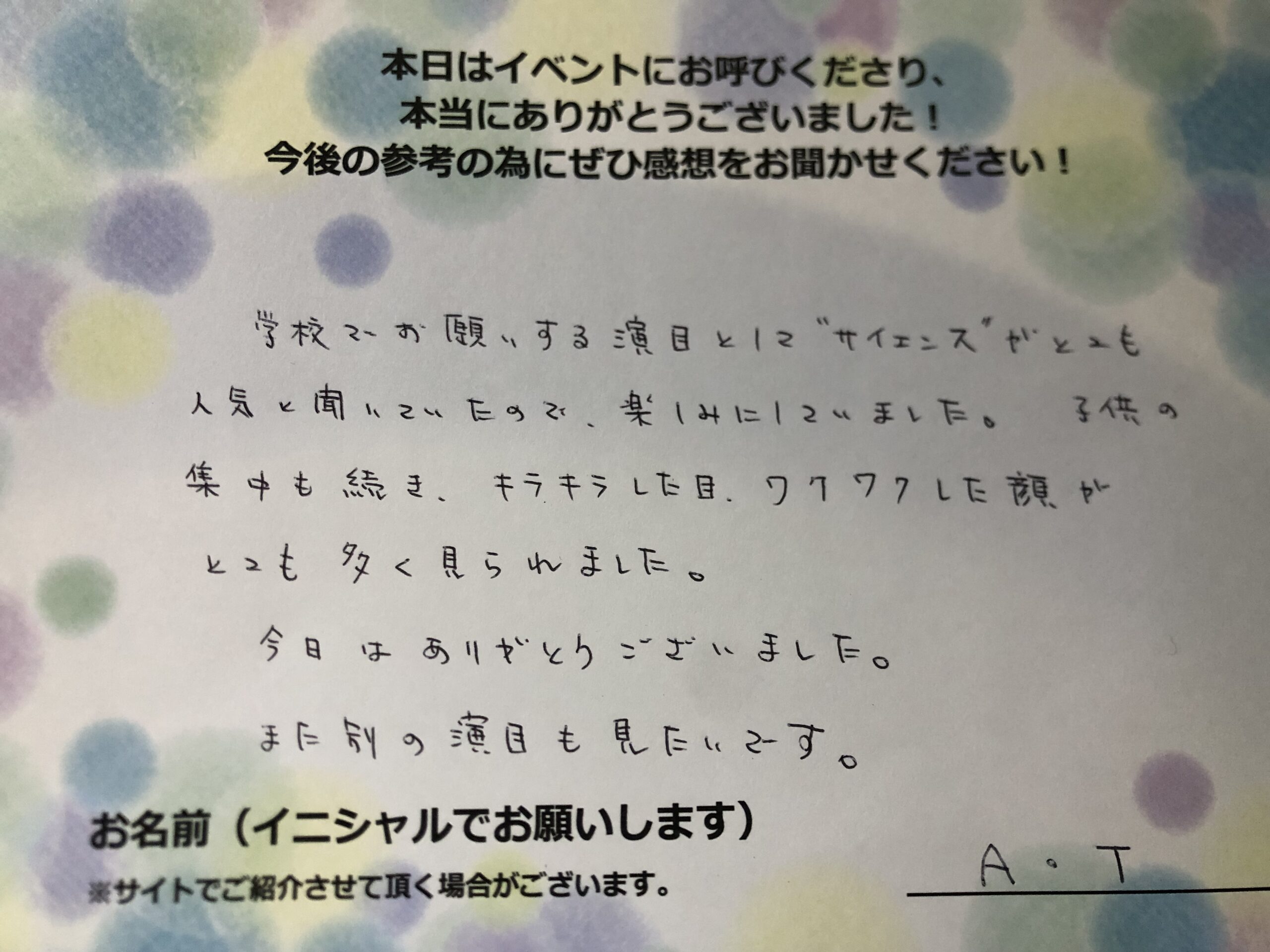 学校でお願いする演目としてサイエンスがとても人気と聞いていたので楽しみにしていました。子供の集中も続きキラキラした瞳、ワクワクした顔がとても多く見られました。今日はありがとうございました。また別の演目も見たいです。 A.T