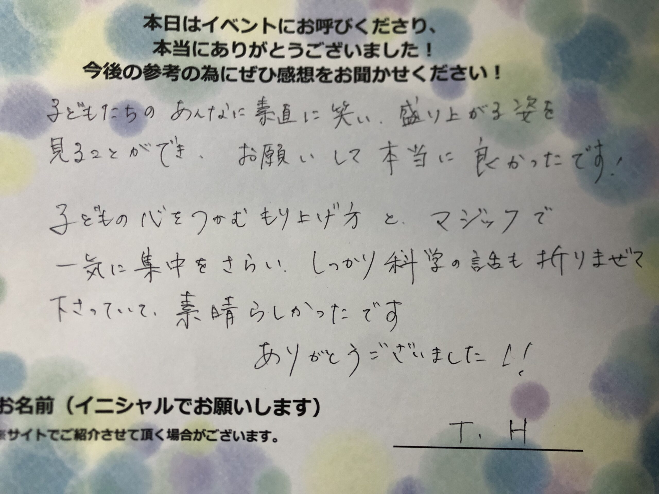 子供たちのあんなに素直に笑い盛り上がる姿を見ることができ、お願いして本当によかったです! 子供の心をつかむ盛り上げ方とマジックで一気に集中おさらいしっかり科学の話も織り交ぜてくださっていて素晴らしかったです。ありがとうございました!!   T.H