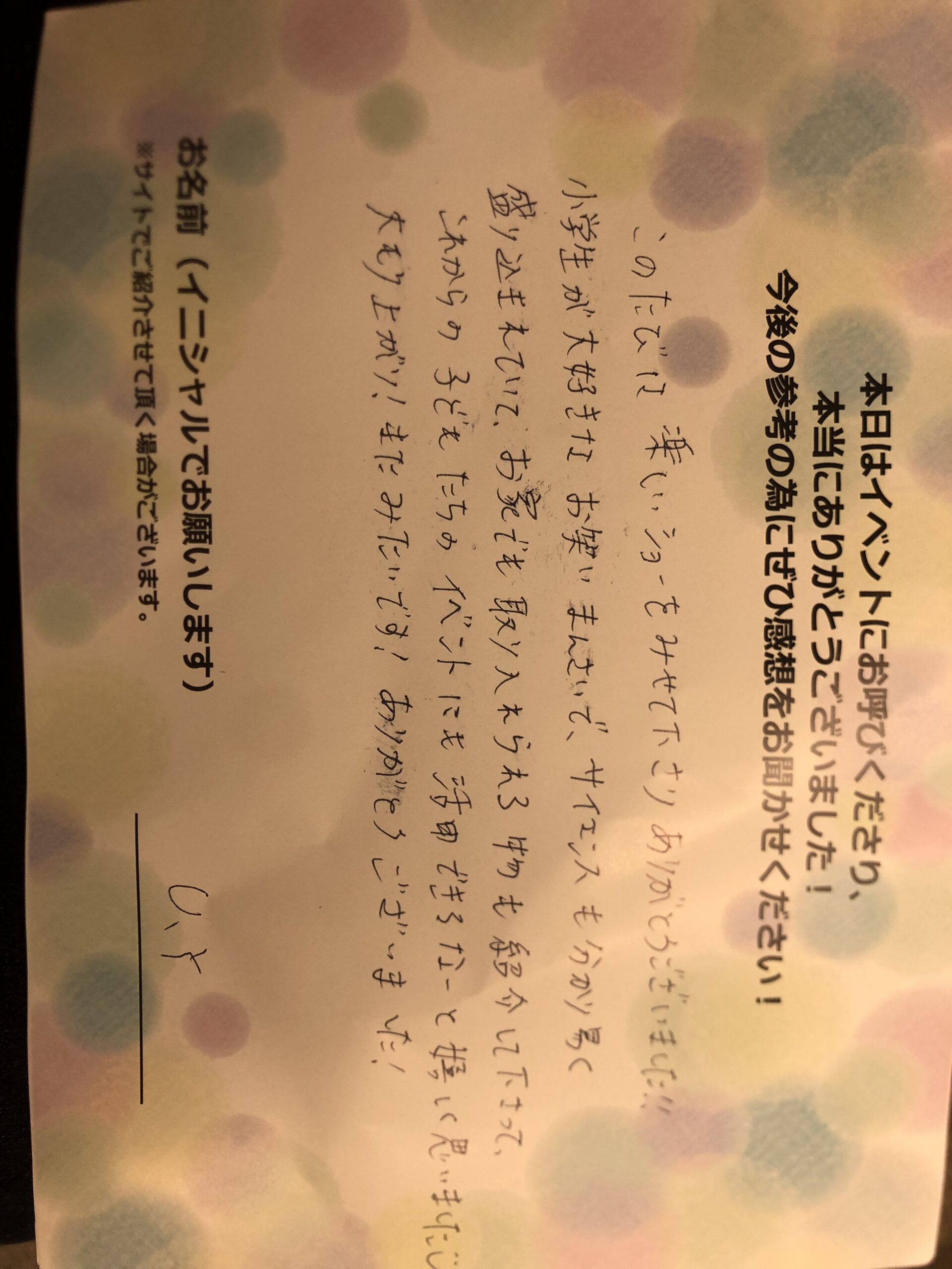 このたびは楽しいショーを見せてくださりありがとうございました!! 小学生が大好きなお笑い満載でサイエンスもわかりやすく盛り込まれていておうちでも、取り入れられるものを紹介してくださってこれからの子供たちのイベントにも活用できるなぁって嬉しく思いました。 大盛り上がり!また見たいです!ありがとうございました! O.Y
