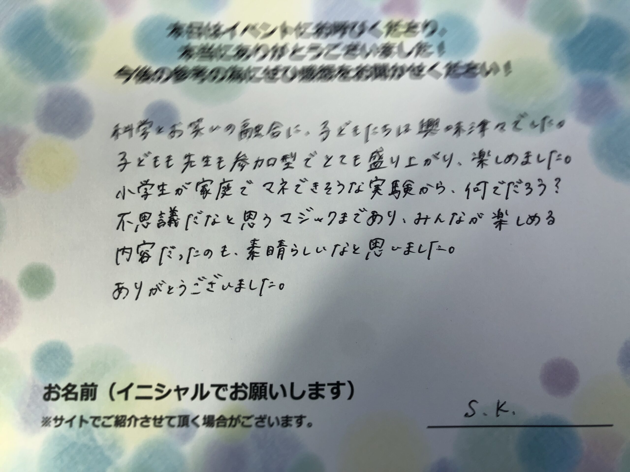 科学とお笑いの融合に子供たちは興味津々でした。子供も先生も参加型でとても盛り上がり楽しめました。小学生が家庭で真似できそうな実験からなんでだろう?不思議だなと思うマジックまであり、みんなが楽しめる内容だったのも素晴らしいなと思いました。ありがとうございました。 S.K