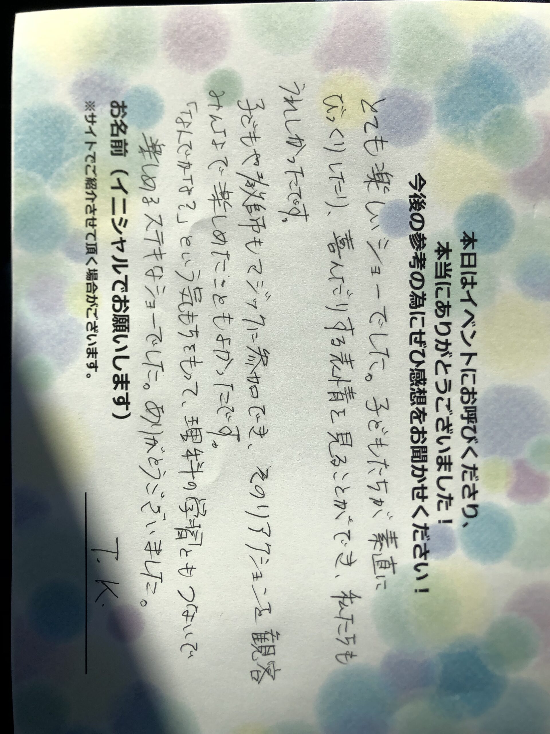 とても楽しいショーでした。子供たちが素直にびっくりしたり、喜んだりする表情を見ることができ、私たちも嬉しかったです。子供や教師もマジックに参加でき、そのリアクションを観客みんなで楽しめたこともよかったです。なんでかな?という気持ちを持って理科の学習ともつないで楽しめる素敵なショーでした。ありがとうございました。 T.K