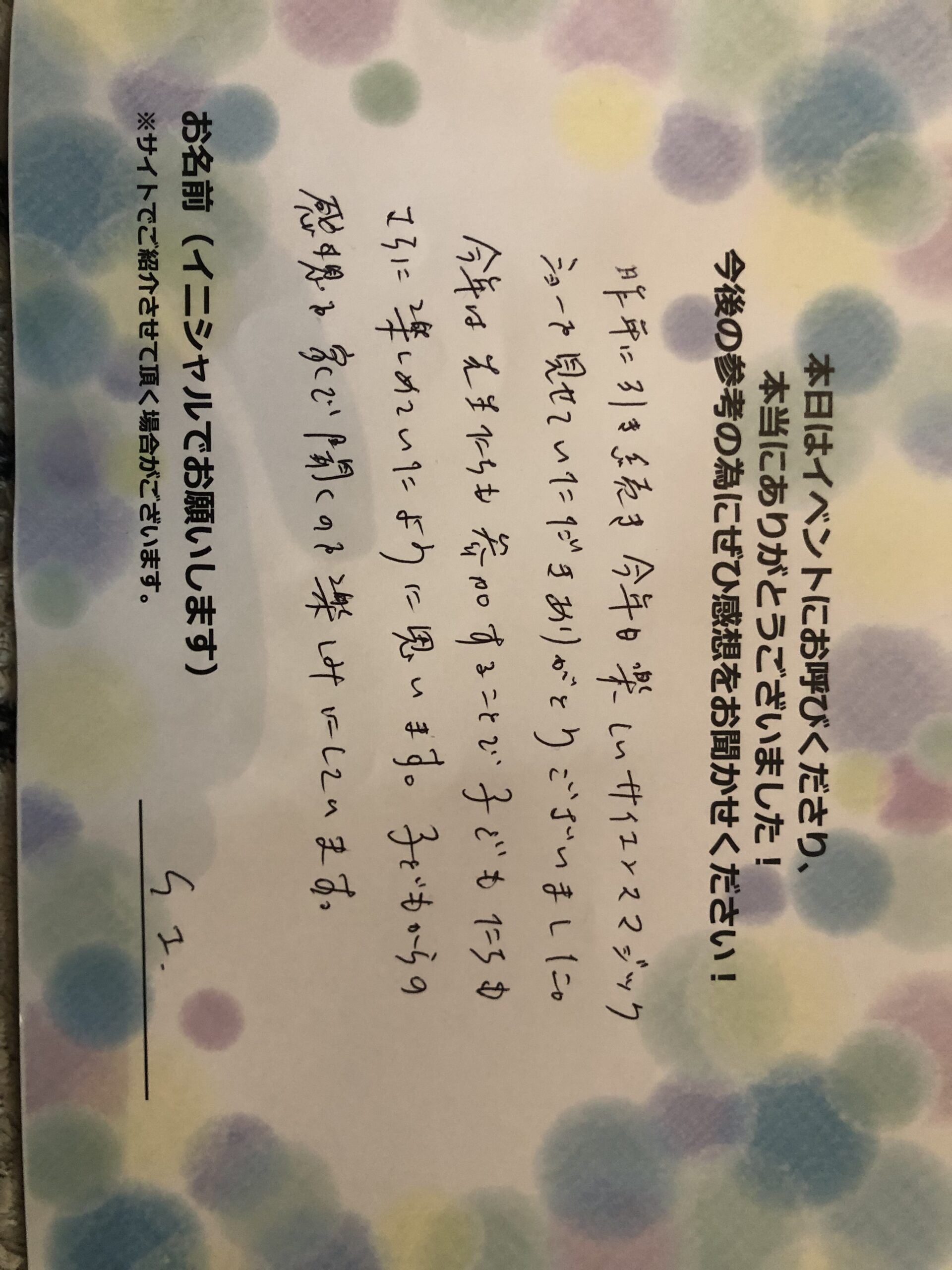 昨年に引き続き今年も楽しいサイエンスマジック上で見せていただきありがとうございました。今年は先生たちも参加することで、子供たちもさらに楽しめていたように思います。子供からの感想を家で聞くのを楽しみにしています。 S.I