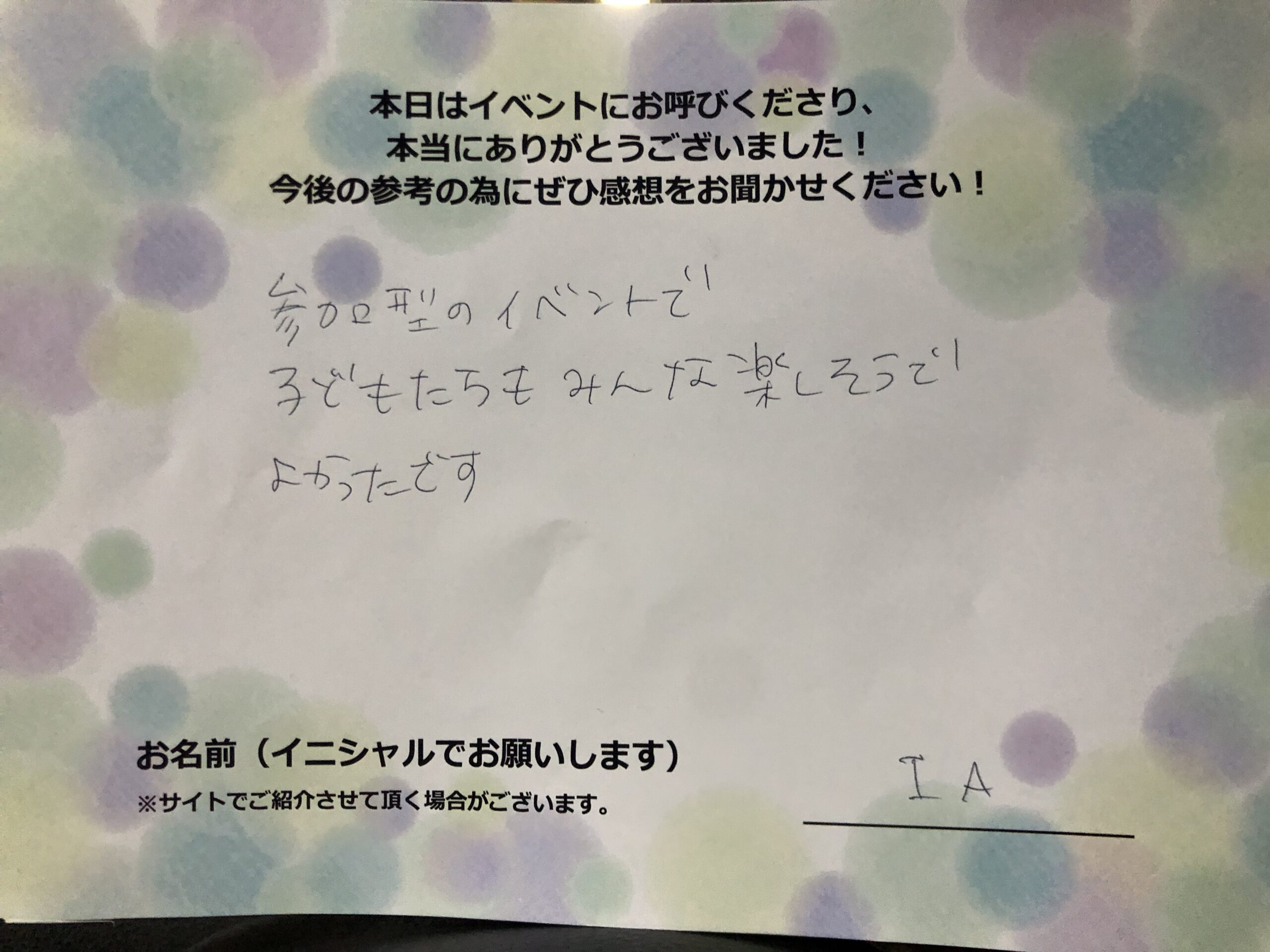 お客様の声参加型のイベントで、子供たちもみんな楽しそうでよかったです。 I.A