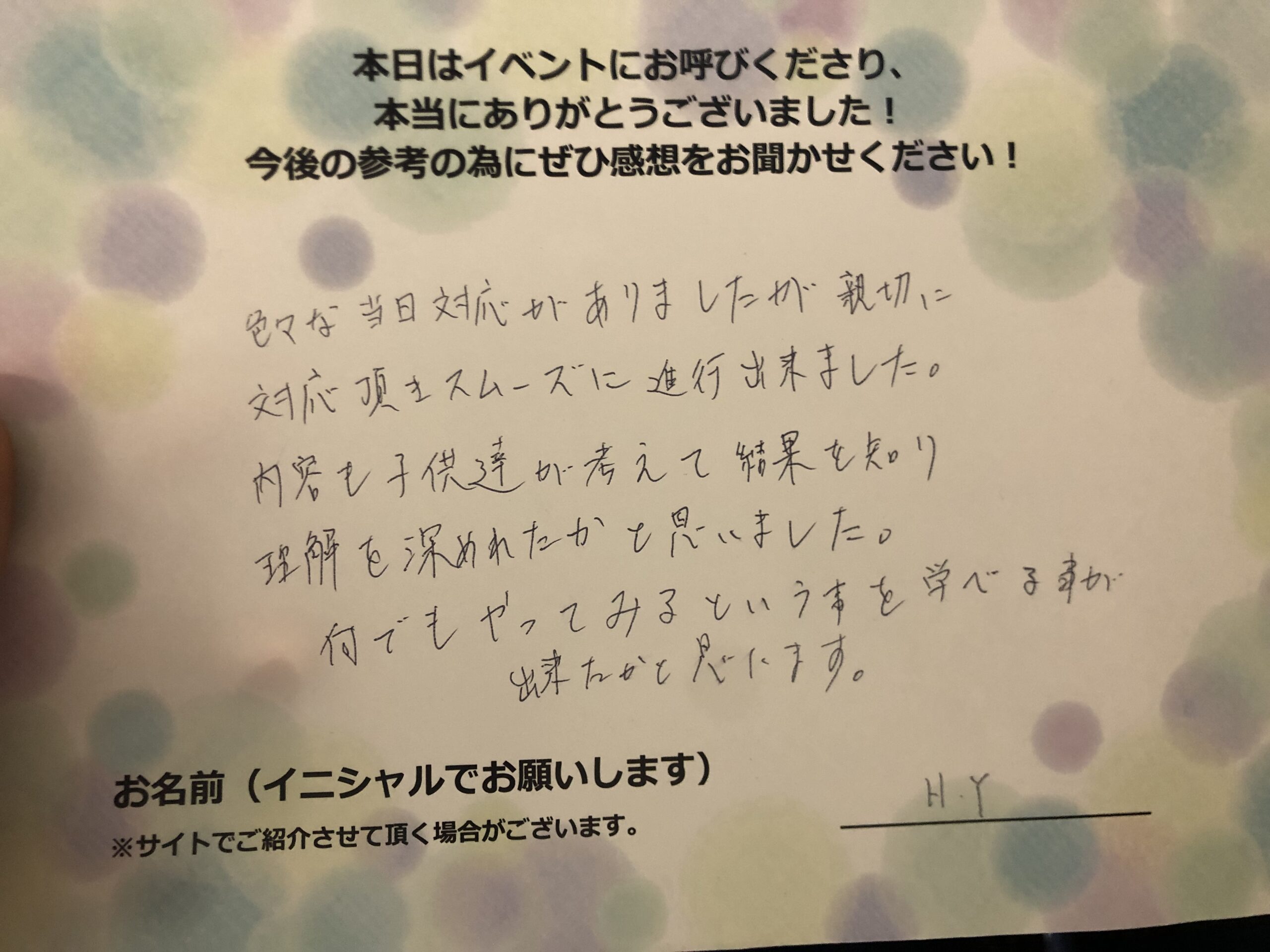 いろいろな当日対応がありましたが、親切に対応いただきスムーズに進行できました。内容も子供たちが考えて結果を知り理解を深めれたかと思いました。何でもやってみるということを学べることができたかと思います。  H.Y