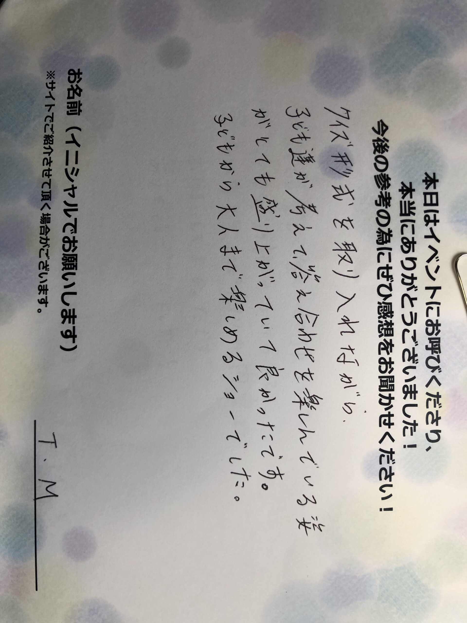 お客様の声クイズ形式を取り入れながら、子供たちが考えて答え合わせを楽しんでいる姿がとても盛り上がっていてよかったです。子供から大人まで楽しめるショーでした。 T.M