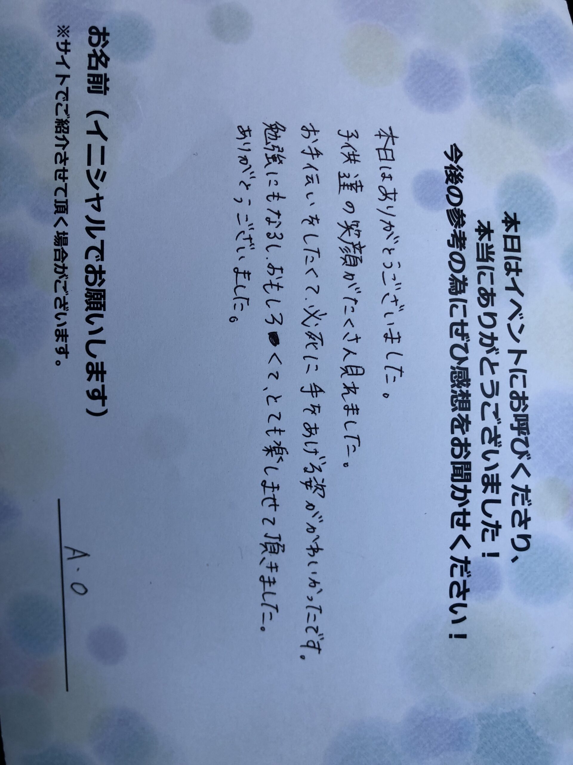 本日はありがとうございました。子供たちの笑顔がたくさん見れました。お手伝いをしたくて、必死に手をあげる姿が可愛かったです。勉強にもなるし、面白くてとても楽しませていただきました。ありがとうございました。  A.O