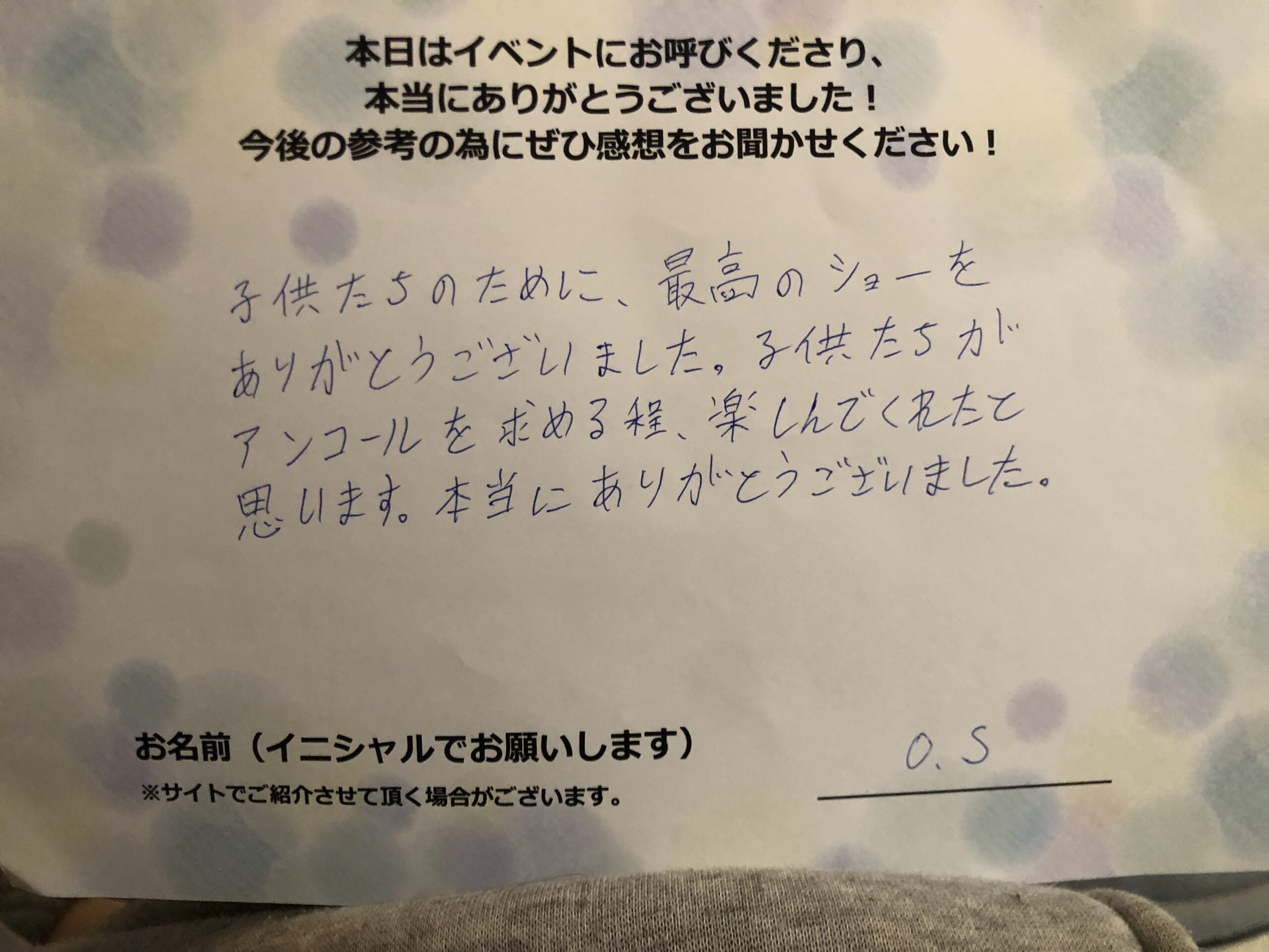 子供たちのために最高のショーをありがとうございました。子供たちがアンコールを求めるほど楽しんでくれたと思います。本当にありがとうございました。 O.S
