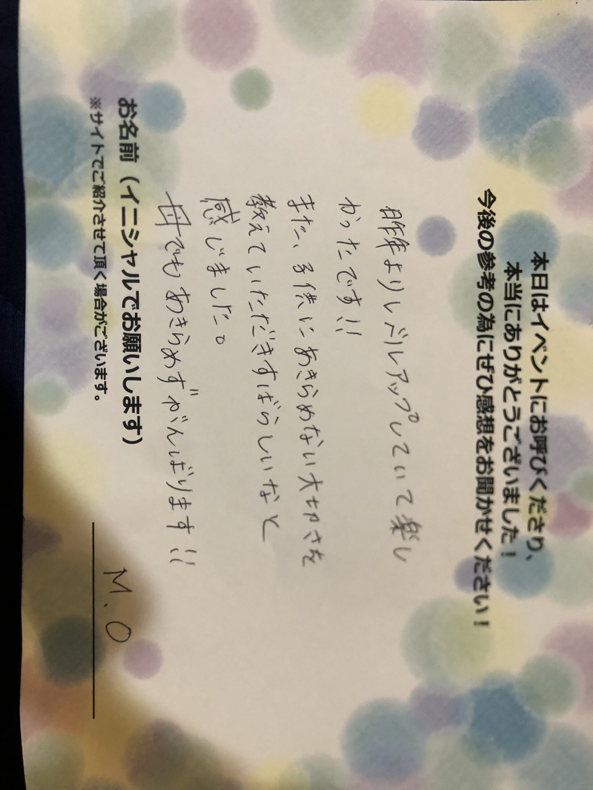 昨年よりレベルアップしていて楽しかったです!! また子供にあきらめない大切さを教えていただき素晴らしいなと感じました。母でもあきらめずがんばります!!    M.O
