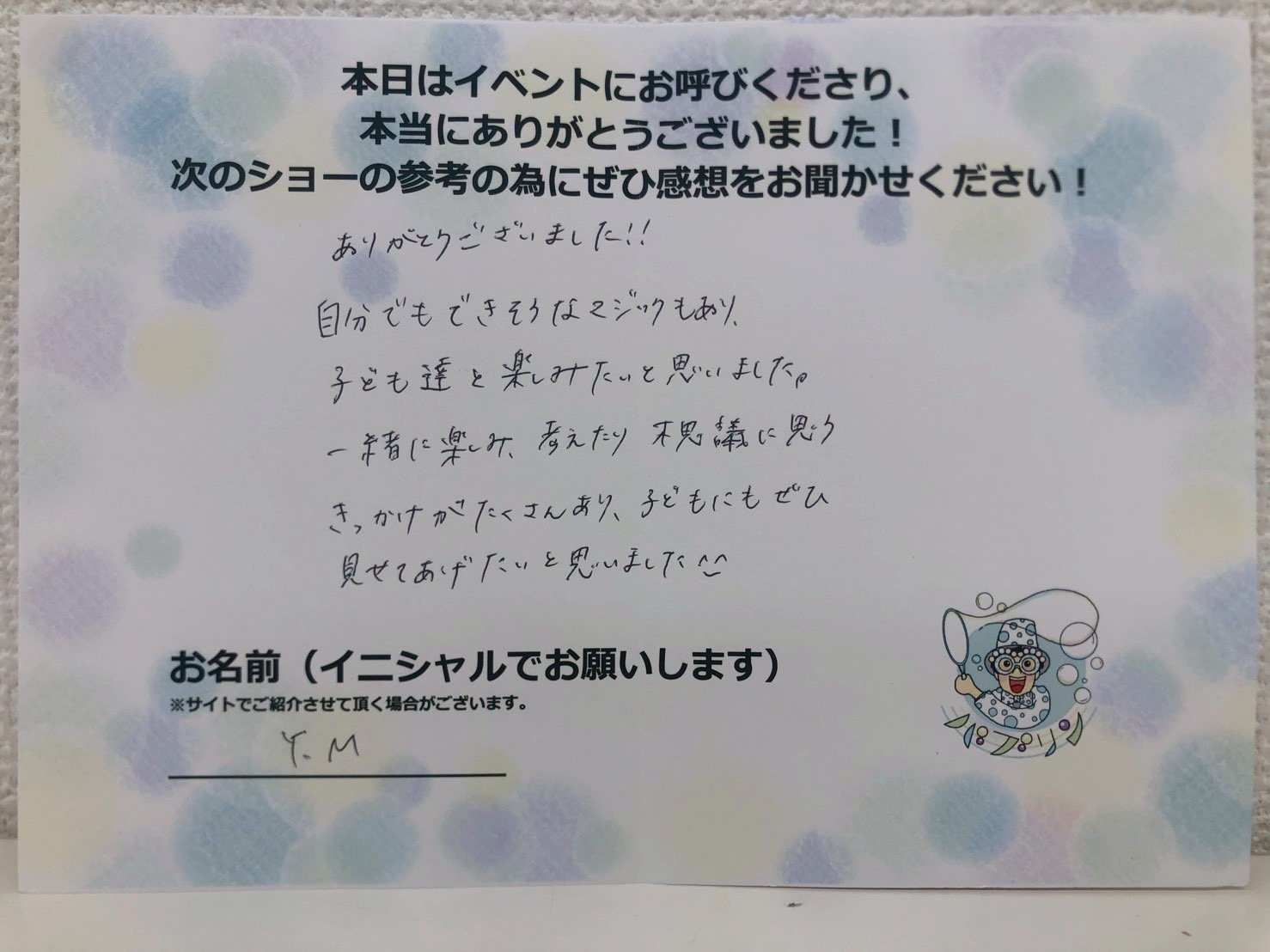 ありがとうございました!! 自分でもできそうなマジックもあり、子供たちと楽しみたいと思いました。一緒に考えたり、楽しみ、不思議に思うきっかけがたくさんあり子供にもぜひ見せてあげたいと思いました。 Y.M