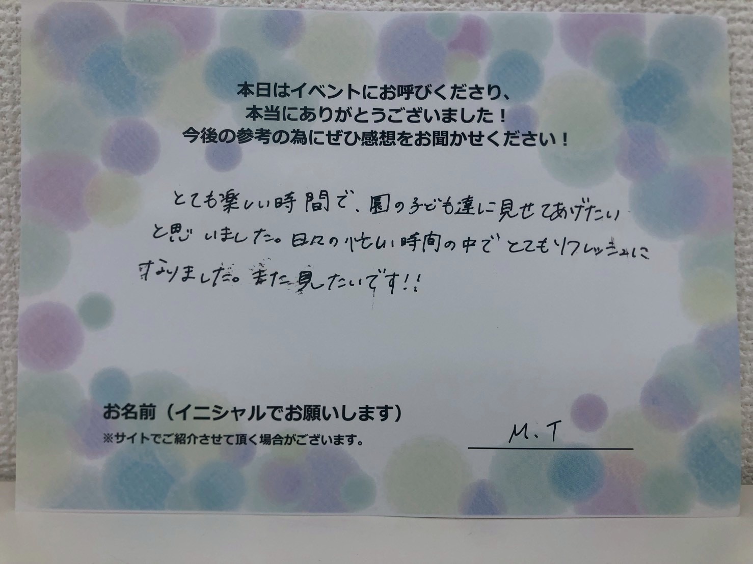 お客様の声とても楽しい時間で、園の子供たちにも見せたいあげたいと思いました。日々の忙しい時間の中でとてもリフレッシュしましたまた見たいです!!