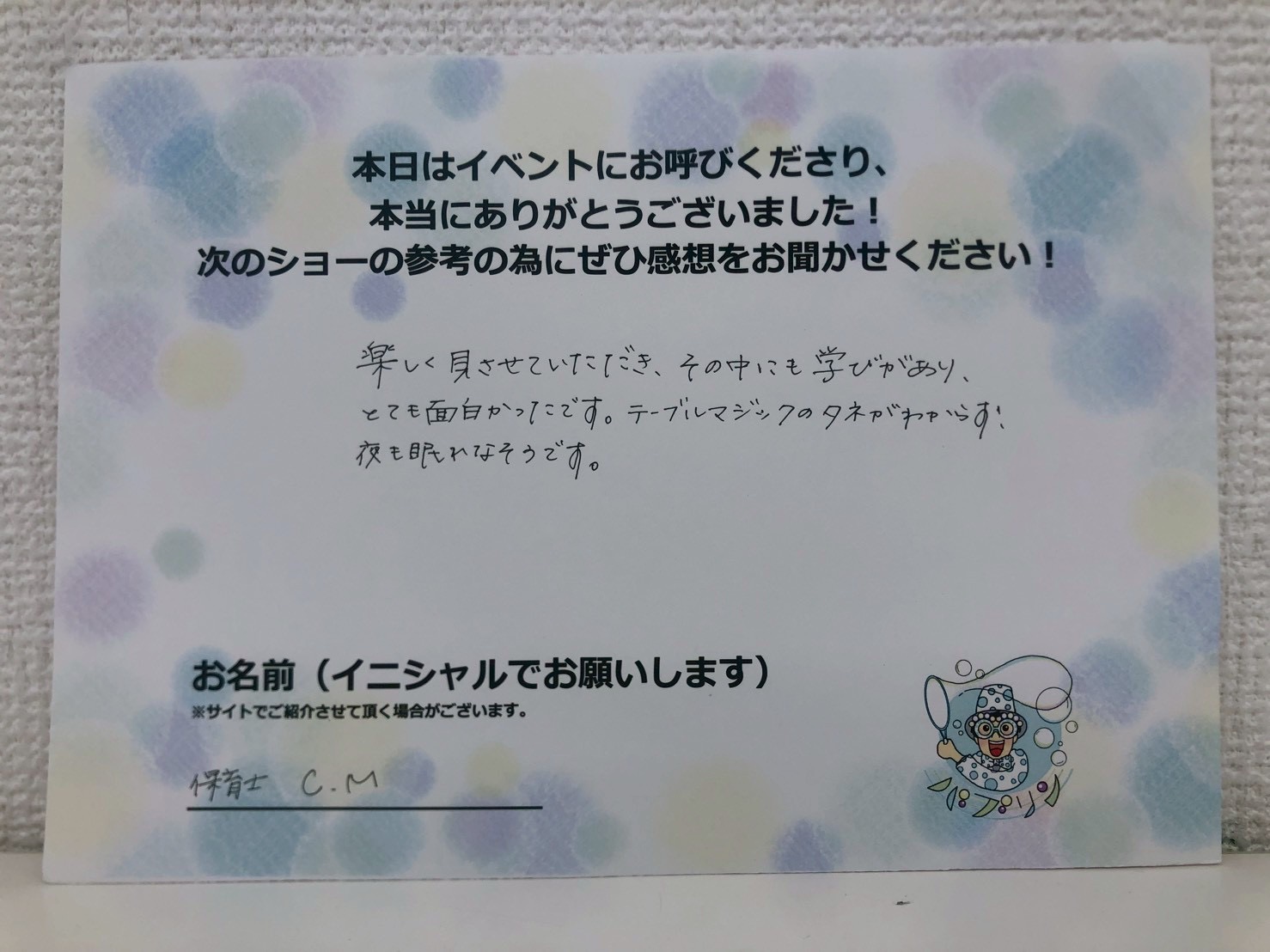 楽しく観させていただき、その中にも学びがありとても面白かったです。テーブルマジックのネタがわからず、夜も眠れなかったです。