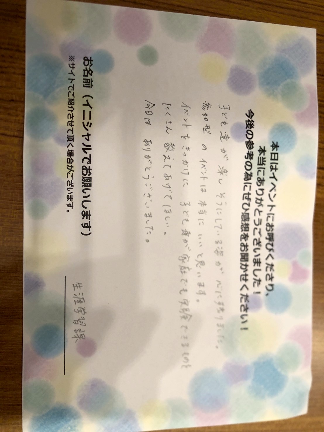 子供たちが楽しんでいる姿が心に残りました。参加型のイベントはほんとにいいと思います。イベントをきっかけに、子供たちが家庭でできるものをたくさん教えて欲しい。今日はありがとうございました。 生涯学習課