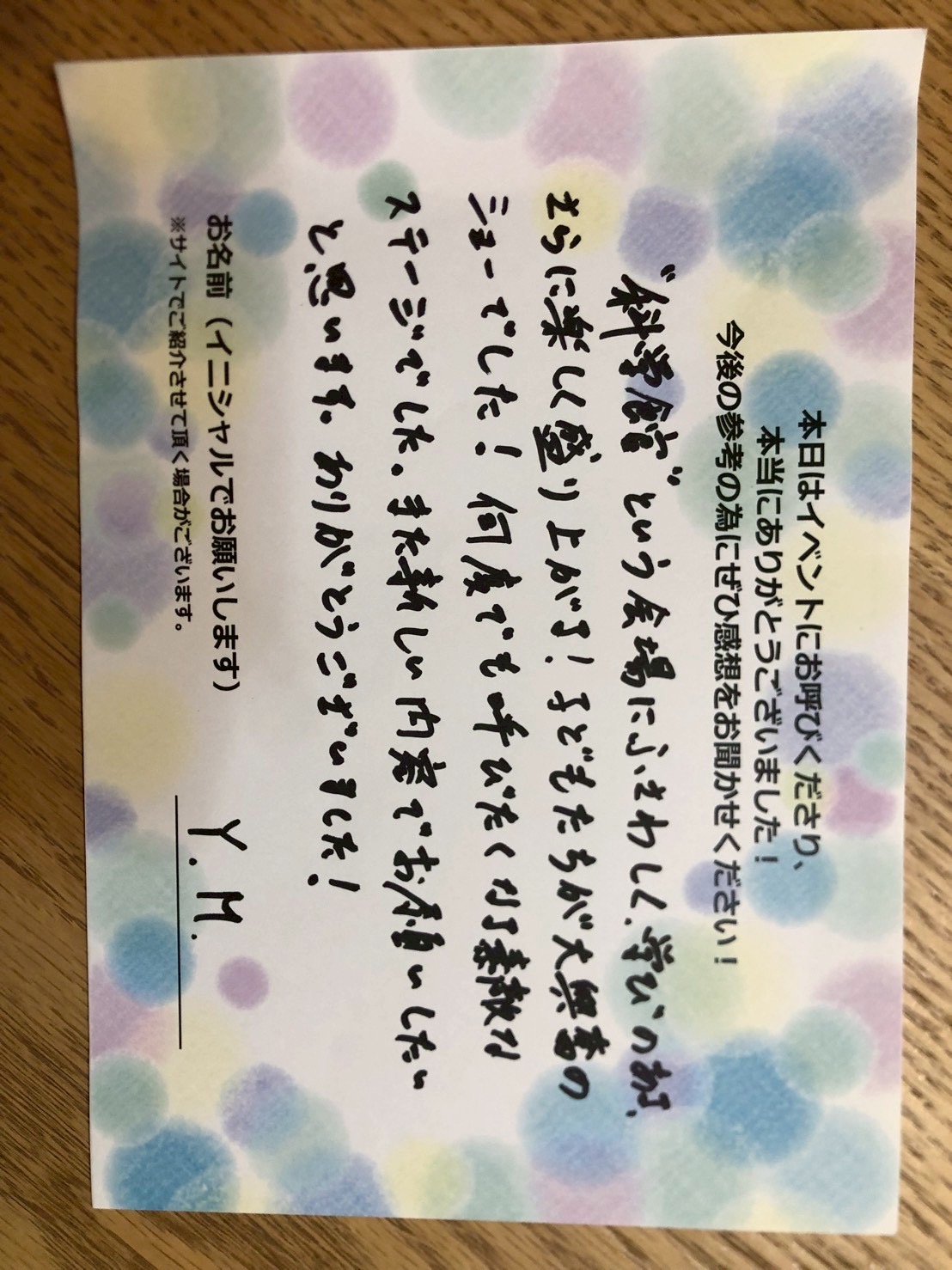 科学館と言う会場にふさわしく、学びのある、さらに楽しく盛り上がる!! 子供たちが大興奮のショーでした!何度でも呼びたくなる素敵なステージでした。また新しい内容でお願いしたいと思います。ありがとうございました!! Y.M