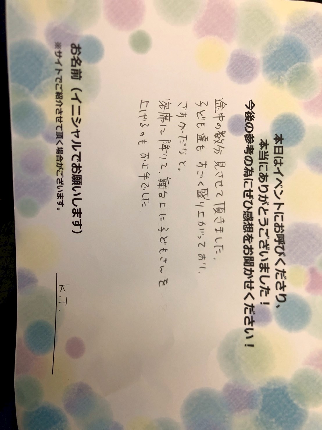 お客様の声途中の数分見させていただきました。子供たちもとても盛り上がっておりさすがだなと客席に降りて、舞台上に子供を上げるのもとてもお上手でした。 K.T