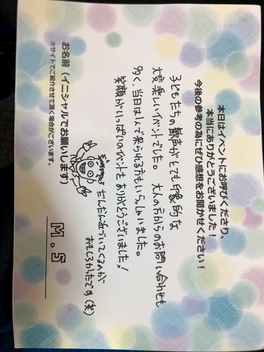 子供たちの感性がとても印象的な大変楽しいイベントでした。大人の方からのお問い合わせも多く、当日は1人で来られるお客様もいらっしゃいました。笑顔がいっぱいのイベントをありがとうございました!!だんだん近づいてくるのが面白かったです(笑   M.S