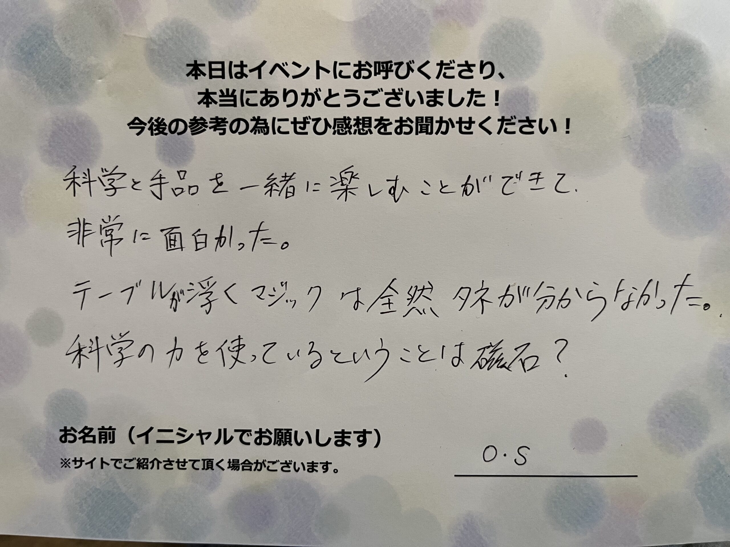 科学と手品を一緒に楽しむことができて非常に面白かった。テーブルが浮くマジックは全然種がわからなかった。科学の力を使っていると言う事は磁石? O.S