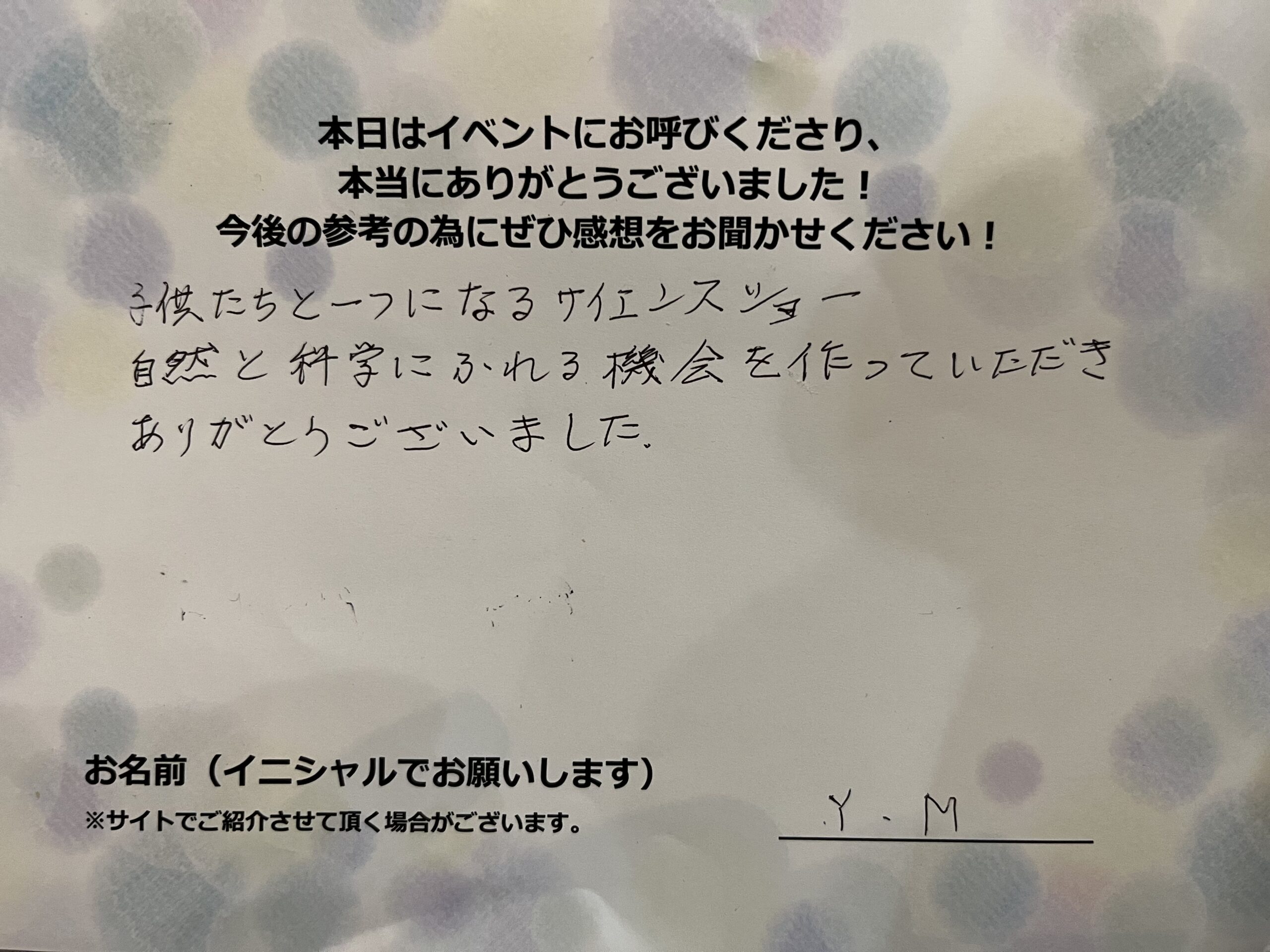 子供たちと1つになるサイエンス賞自然と科学に触れる機会を作っていただきありがとうございました。 Y.M