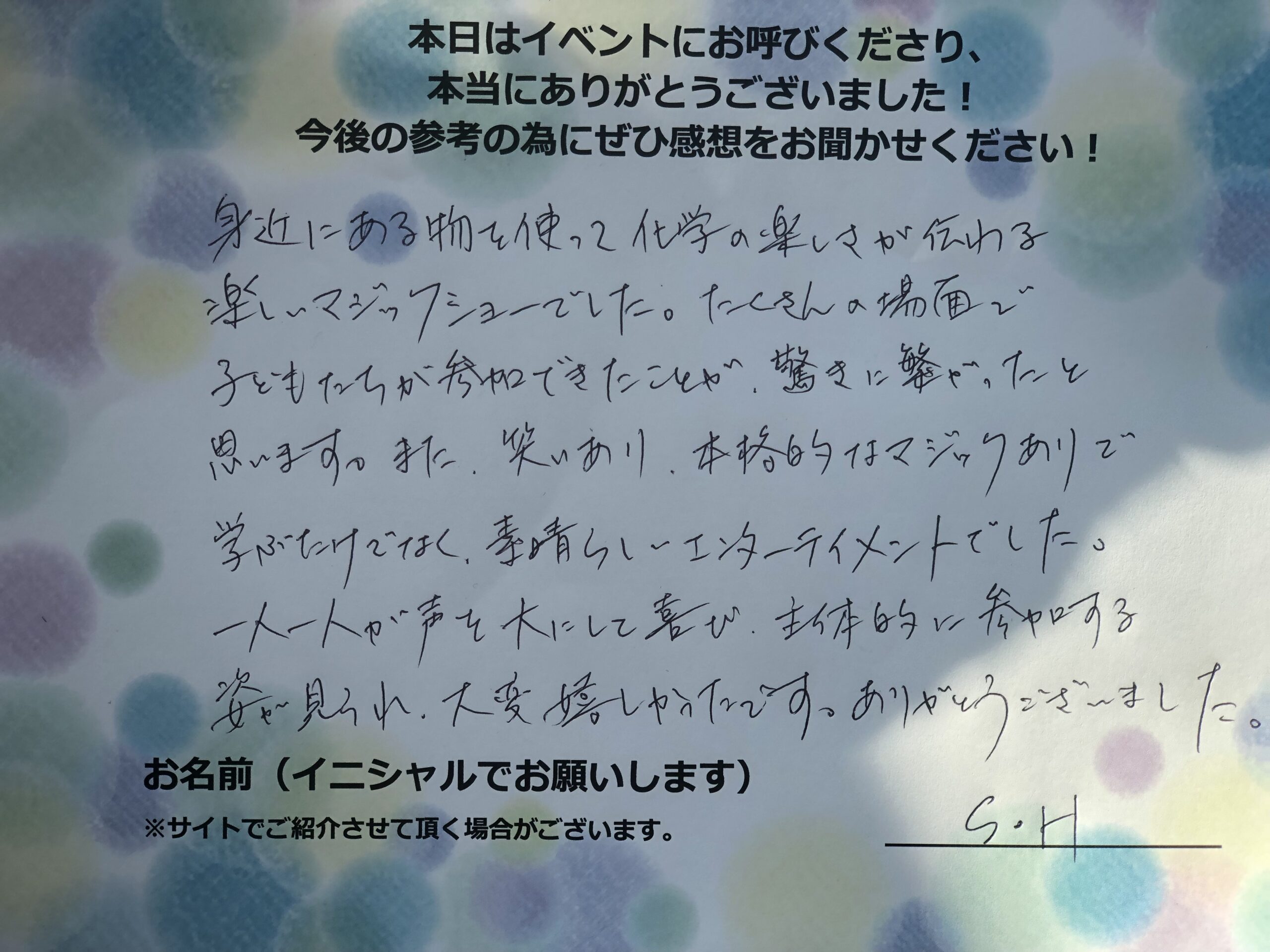 身近にあるものを使って科学の楽しさが伝わる楽しいマジックショーでした。たくさんの場面で子供たちが参加できたことが驚きにつながったと思います。また笑いあり本格的なマジックありで学ぶだけでなく素晴らしいエンターテイメントでした。一人一人が声を大にして喜び主体的に参加する姿が見られ大変うれしかったです。ありがとうございました。 S.H