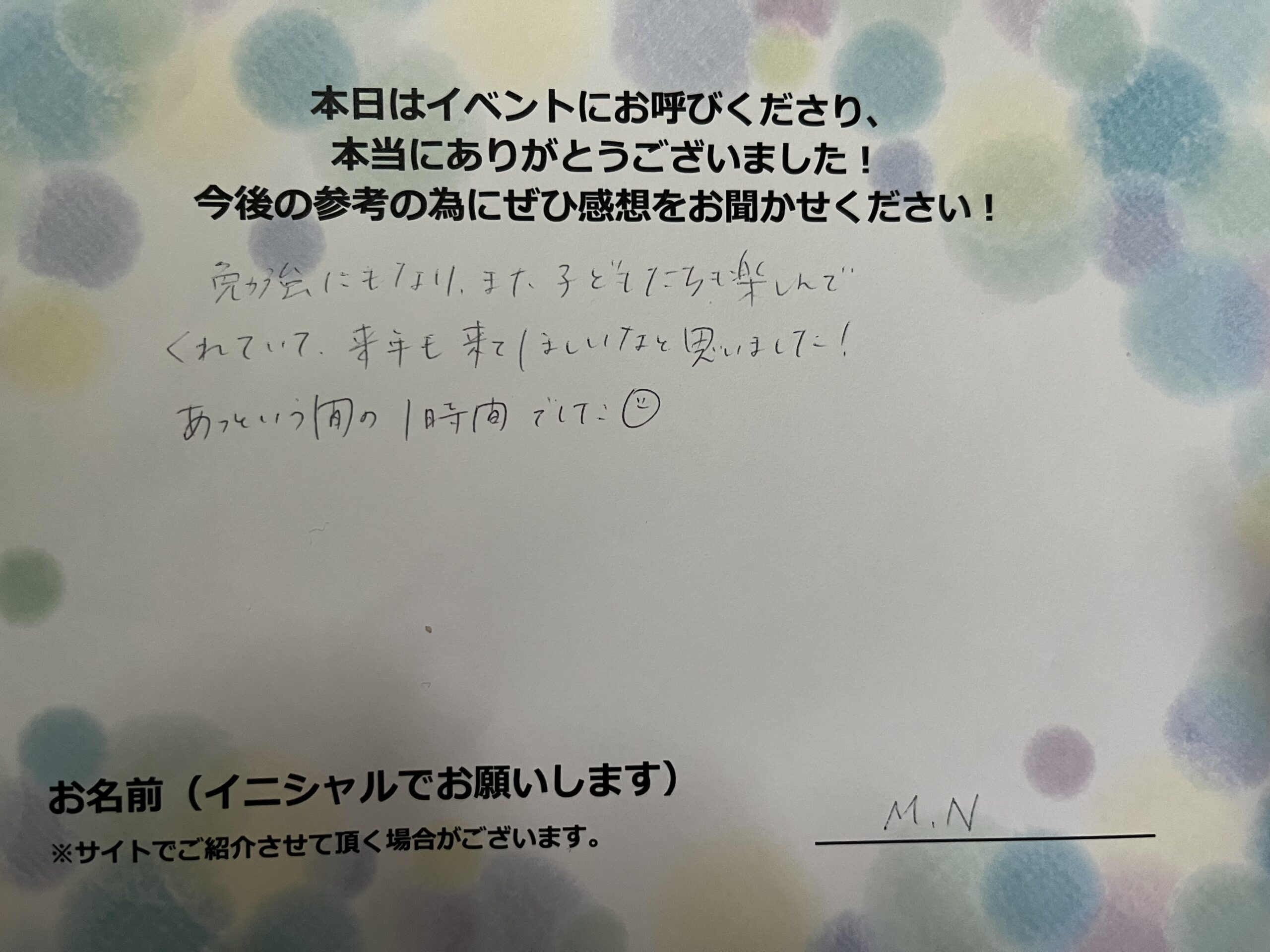 お客様の声勉強にもなりました。子供たちも楽しんでくれていて、来年も来て欲しいなと思いました! あっという間の1時間でした☺️ M.N