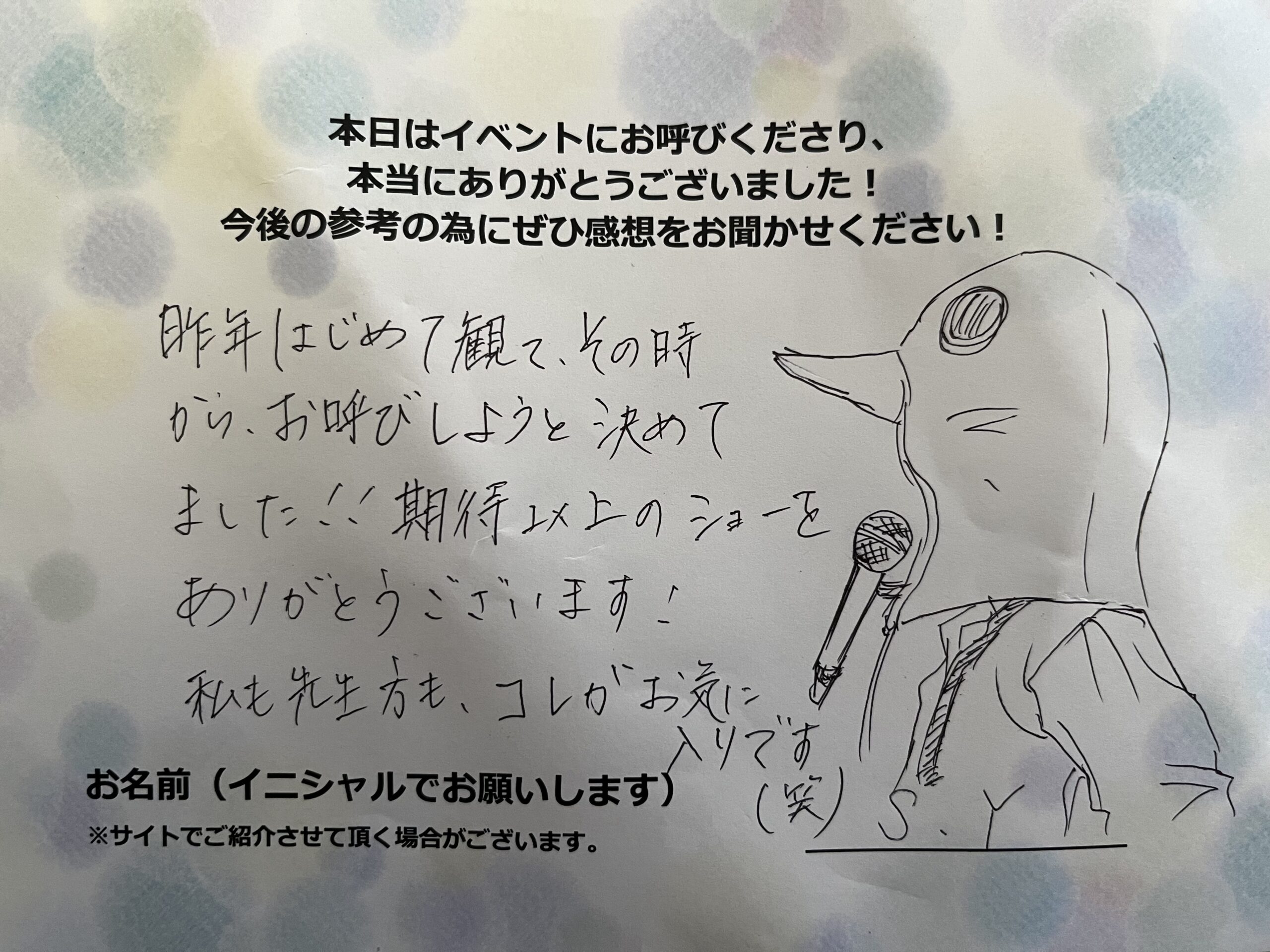 昨年初めて観て、その時からお呼びしようと決めてました!!  期待以上のショーをありがとうございます!私も先生方もこれがお気に入りです。
