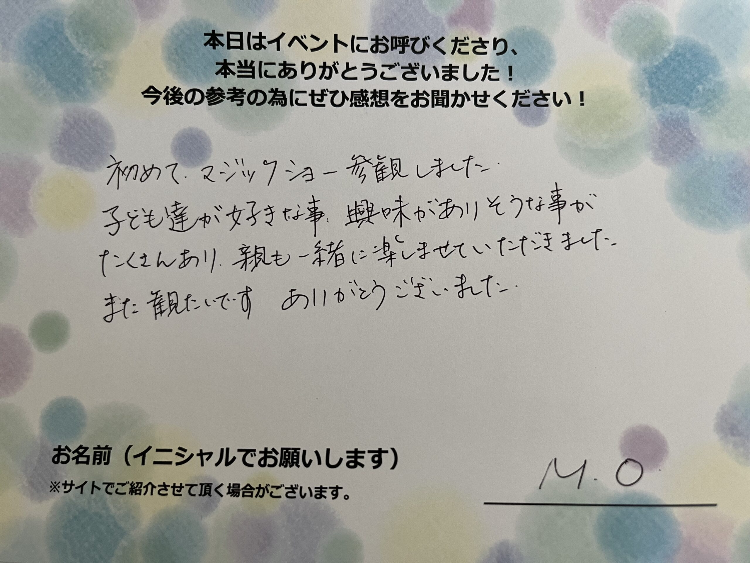 初めてマジックショーを参観しました。子供たちが好きなこと興味がありそうなことがたくさんあり、親も一緒に楽しませていただきました。また見たいです。ありがとうございました。 M.O