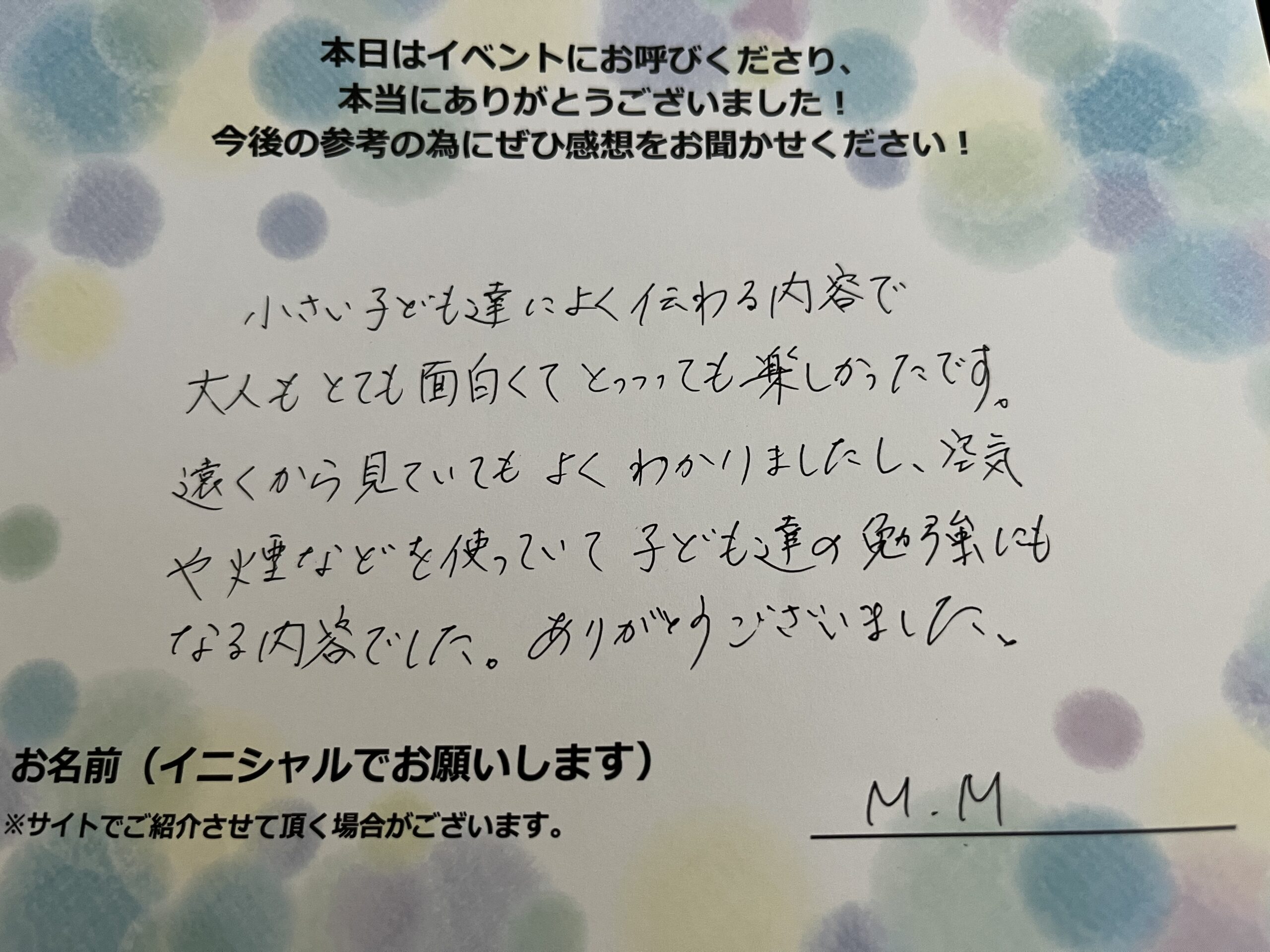 お客様の声小さい子供たちによく伝わる内容で、大人もとても面白くて、とっても楽しかったです。遠くから見ていてもよくわかりましたし、空気や煙などを使っていて、子供たちの勉強にもなる内容でした。ありがとうございました。 M.M