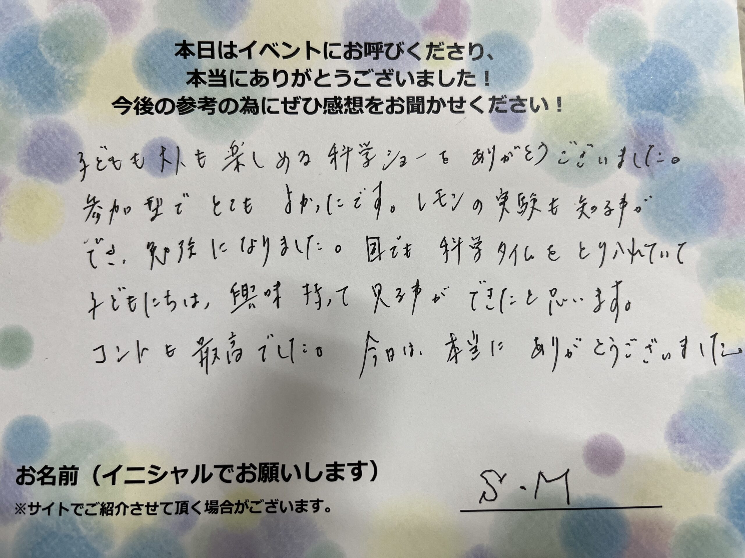 子供も大人も楽しめる科学ショーをありがとうございました。参加型でとても良かったです。レモンの実験も知ることができ、勉強になりました。目でも科学タイムを取り入れていて、子供たちは興味持ってみることができたと思います。コントも最高でした。今日は本当にありがとうございました。