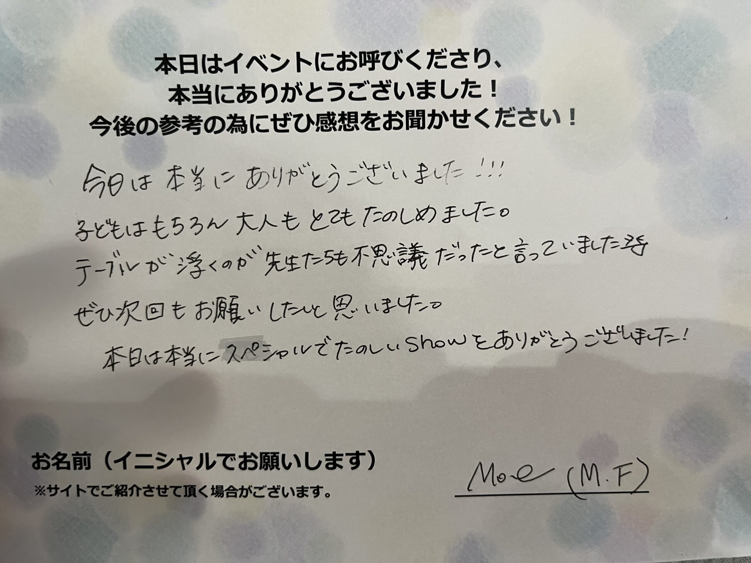 今日は本当にありがとうございました!!!子供はもちろん大人もとても楽しめました。テーブルが浮くのが先生たちも不思議だったと言っていました。ぜひ次回もお願いしたいと思いました。本日は本当にスペシャルで楽しいショーをありがとうございました! MOE(M.F)