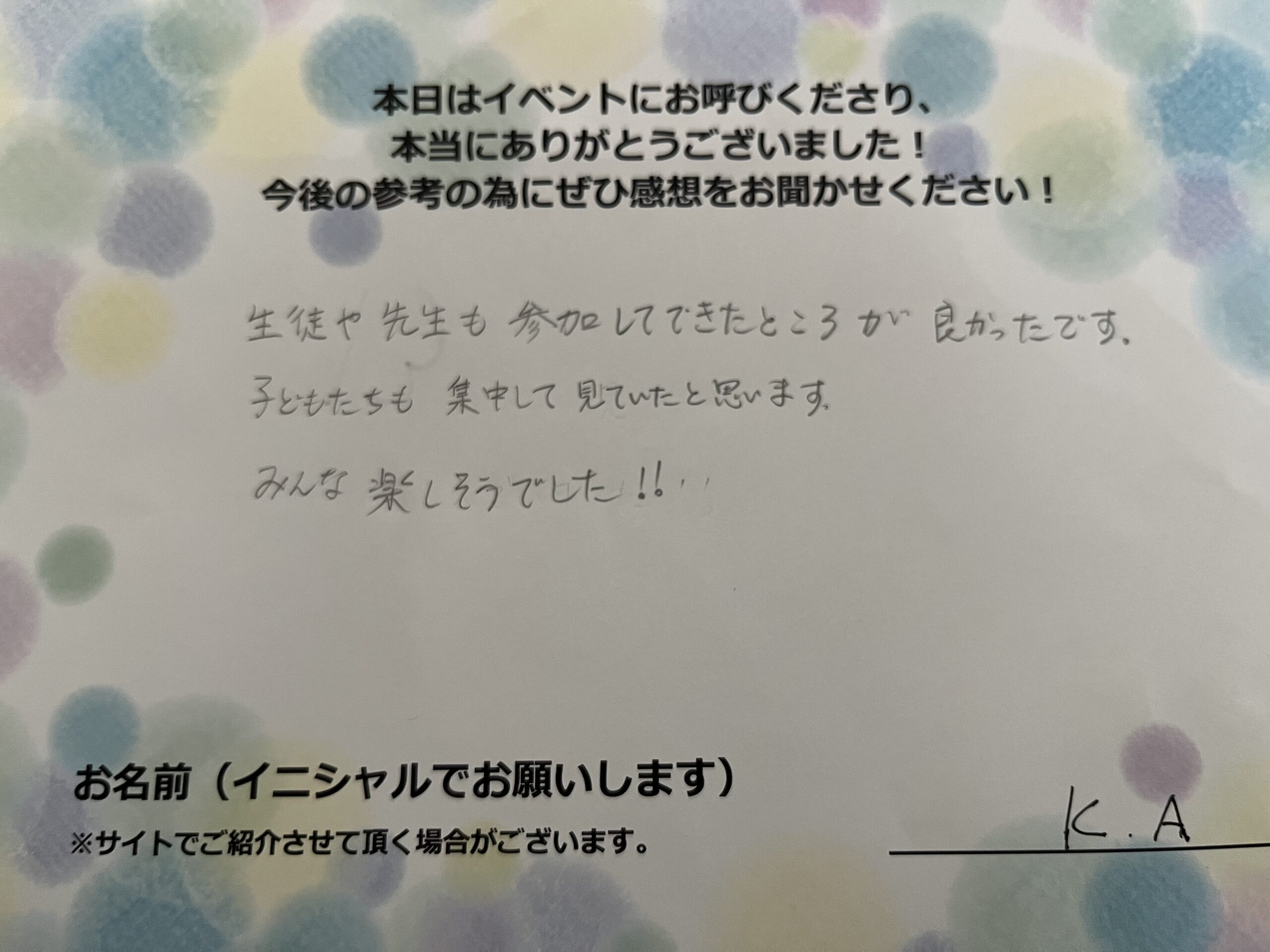 お客様の声生徒や先生も参加してできたところがよかったです。子供たちも集中して見ていたと思います。みんな楽しそうでした!! K.A