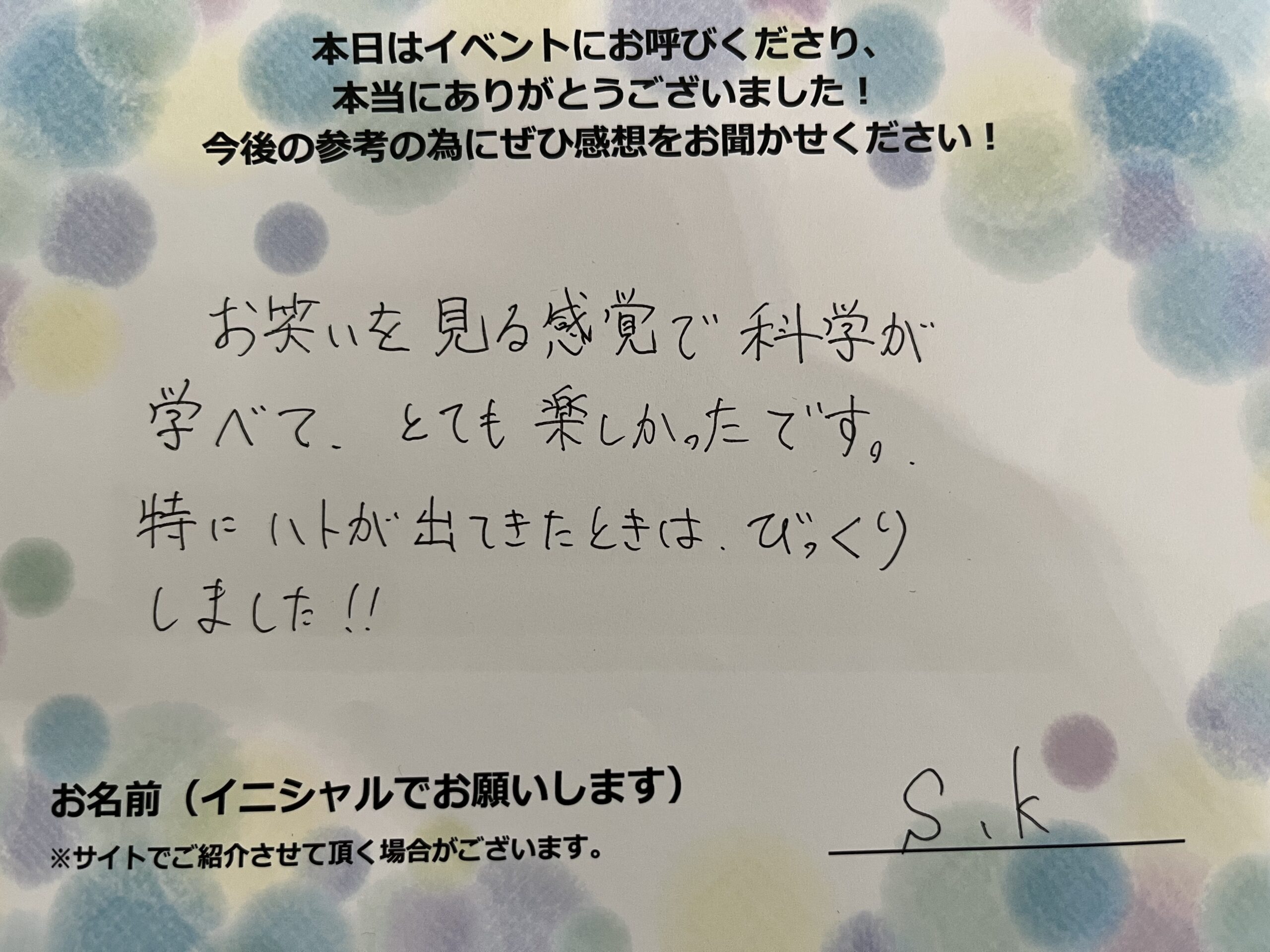 お笑いを見る感覚で科学が学べてとても楽しかったです。特に鳩が出てきた時はびっくりしました!!   S.K
