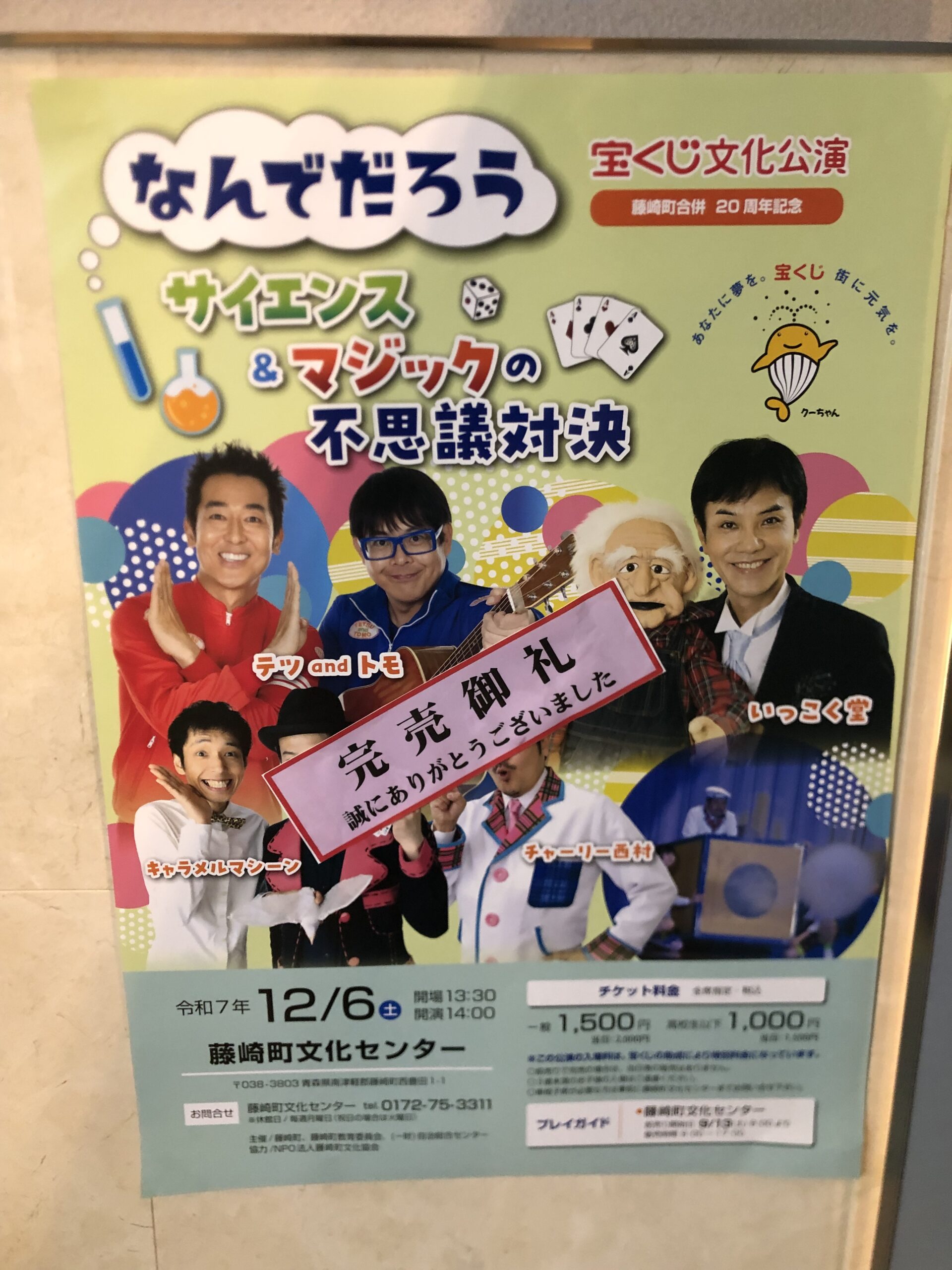 本日は東京から、とおーく離れた青森県❗️ しかも2泊の弾丸ツアー!しかも、いっこく堂さん、テツandトモさん、チャーリー西村さんと一流のレジェンドの方々とツアーということもあり前日からテンションあげあげでのぞみましたー! 音響さん照明さんマネージャーさん、出演者も一緒の団体バスで前乗り。 出番前の楽屋などで貴重な体験談を聞いたり話したりしてとても有意義な時間でした!😆  終わってまたバスで2日目は陸奥へ!明日も張り切って頑張るぞー♪ テッテレ    キャラメルマシーンおだじ